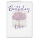 Um belo cartão de aniversário para aquele que você ama. A árvore cor-de-rosa com pássaros cantando alegremente em cores pastel macio. Para os Aniversários jovens e velhos