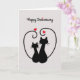 Uma doce saudação de aniversário com dois gatos pretos com caudas longas formando um coração, acentuado com dois corações vermelhos em um fundo cinza e branco com bolinhas. A letra "i" em aniversário é pontilhada com um coração vermelho.