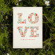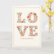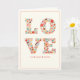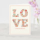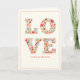 Cartão de saudação elegante de tendências, com letras empilhadas soletrando "LOVE" em padrões florais e geométricos com uma borda arredondada. Texto de mensagem personalizável. Perfeito para Dia de os namorados, Dia Mais Doce, aniversário de casamento ou qualquer dia! Disponível em uma seleção curada de cores vibrantes de fundo. Também disponível como uma placa plana moderna.