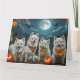 Libere o espírito assustador com esta design sombria do Dia das Bruxas apresentando um bando de cachorros sob um céu escuro e iluminado, cercado por morcegos voadores e abóboras brilhantes. Perfeito para aqueles que amam um toque de diversão terrível com seus amigos peludos!