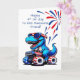 Mande uma grande explosão de diversão do 4 de julho com este cartão ousado e divertido! Um dinossauro sorridente em óculos de sol patrióticos conduz um caminhão monstro através de uma tela colorida de fogo de artifício. Excelente para amigos que amam ação, humor e diversão americana!