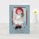 Boneca de pano do vintage com o buquê da margarida no quadro vermelho de canto cortado para o aniversário. Personalize o cartão com todo o nome.