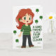 Este cartão apresenta uma menina de cabelos ruivos e olhos esmeralda com um sorriso de boca aberta, em pé à esquerda como se tivesse acabado de se virar para um amigo próximo. Seus cabelos ruivos caem em curvas suaves, e um trevo de quatro folhas está enfiado atrás da orelha como um doce aceno para alguém especial ☘️. Ela usa uma camisa listrada horizontalmente em tons de verde, contra um fundo branco brilhante salpicado de pequenos trevos verde-escuros. A cena parece amigável e um pouco romântica de uma maneira suave, como o sorriso que você compartilha quando está por dentro de um segredo sortudo 💚. No lado direito, letras verdes são empilhadas em linhas claras e leem: “UM BOM AMIGO É COMO UM TREVO DE QUATRO FOLHAS.” O texto se assenta confortavelmente no espaço aberto, equilibrando a figura e atraindo o olhar para a página. Trevos espalhados pontilham o fundo em torno da