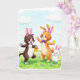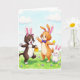 Este cartão mostra três personagens simpáticos parecidos com animais que estão juntos em um campo ensolarado de primavera, suas poses sugerindo uma amizade fácil e um vínculo doce e carinhoso. À esquerda, uma figura parecida com um gato marrom e branco com grandes olhos azuis e um sorriso largo dá um passo à frente, segurando uma pequena cesta amarela como se estivesse trazendo um pequeno presente para compartilhar. No meio, um companheiro parecido com um cão castanho-dourado vestindo uma gravata borboleta violeta estende o braço aberto, embalando suavemente um passarinho amarelo minúsculo que se inclina como se confiasse no grupo. À direita, um pequeno personagem parecido com um coelho branco abre os braços com um sorriso animado 🐰, como se estivesse dando as boas-vindas a alguém na cena. O chão é um gramado verde rico com lâminas de grama visíveis, salpicado com flores silvestres macias roxas e amarelas 🌷 que enquadram o trio como um buquê natural. Qualquer texto de saudação ficaria perto do topo em uma tonalidade pastel clara, com linhas menores colocadas abaixo dos personagens em