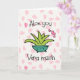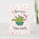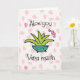 Expresse-se com um cartão de saudação moderno e engraçado. Fofo e doce, este design personalizado apresenta o texto "Aloe (Eu amo) você Vera (muito) muito" em uma fonte serifada excêntrica e uma ilustração de desenho animado plano e fofo de uma planta de aloe vera sorridente com bochechas rosadas e três corações rosa espalhados em um padrão de fundo de corações rosa claro espalhados.