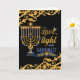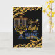 Elegante design de um Menorah iluminado adorava com ramos de oliveira e as palavras Amor, Luz e Felicidade. Uma bela borda ouro sobre um fundo azul escuro. Dentro diz "Feliz Chanucá" com bastante espaço para você escrever sua dedicação à pessoa que receberá este cartão adorável.