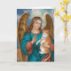 Um anjo com asas douradas vestindo um vestido de turquesa está segurando um gato de mesa laranja.