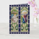 Deseje à família e aos amigos um "Felz pascoa" com este belo cartão religioso simulando o vidro manchado em azuis-escuros ricos, verdes-primavera brilhantes, amarelos quentes e cinzentos prateados. Feito no Estilo de Liberdade, a versão britânica de Art Nouveau, dois longos painéis retangulares com figuras dispostas lado a lado representam dois anjos sentados no túmulo vazio à esquerda e os Três Marys vêm unir o corpo de Jesus à direita em quadros ovais cercados de verde estilizado. + Dentro: Um grande painel com lírios Páscoas estilizados. Image Credit (RT 01): Imagens antigas de um cartão-postal gravado em cromolitografia intitulado A Peaceful Páscoa, Páscoa Hymns Series, No. 714, originalmente publicado por Raphael Tuck & Sons, Londres, Inglaterra, e impresso na Saxónia, Alemanha, 1912, a partir da coleção privada do desenhador.