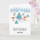 Cartão de aniversário com uma cena de floresta esbranquiçada. Felizes animais florestais dançando em torno de uma árvore de abetos verde com presentes embaixo. design de aquarela feliz e alegre.