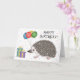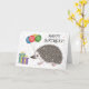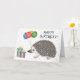 A ilustração original do desenho de Destei de um lindo animal africano Pygmy Hedgehog. O ouriço é fotografado de lado e ele está segurando balões coloridos de aniversário em sua boca. Há também dois presentes colocados em frente ao ouriço. Uma caixa atual é roxa e a outra é verde-lacrimejante. Ambos os presentes estão embrulhados com fita amarela. O fundo tem um padrão de confete pastel colorido sobre um fundo branco. Há também uma área de texto personalizável que agora diz: "Feliz aniversário!".