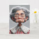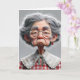 Uma idosa com traços exagerados está vestindo óculos e uma blusa de gingham vermelha e branca com um colar de rendas.