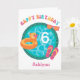Cartão de aniversário personalizado de 6 para raparigas com um design colorido na frente do cartão, com chinelos de pato, cor-de-rosa, óculos de sol e uma piscina. Você poderá personalizar facilmente o cartão com a idade de aniversário, o nome e a mensagem de dentro. Um único cartão de aniversário de verão personalizado para meninas.