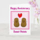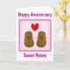 Cartão de aniversário divertido para aquele especial. Um quadrado rosa com uma estrutura rosa e branca e coberto de bolhas brancas. Duas batatas de desenho marrom felizes viradas umas para as outras com sorrisos felizes grandes em seus rostos. Acima deles há um coração de amor rosa e vermelho. Acima da imagem está um modelo que lê feliz aniversário e abaixo de outro modelo que lê batata doce. Ambas as mensagens podem ser deixadas como estão ou mudadas para sua própria mensagem usando as caixas de texto.