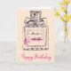 Um cartão de aniversário de ilustração de moda de uma obra de arte original do artista Sacha Grossel de uma garrafa de perfume de perfume de perfume rosa. Esta ilustração aquarela de um perfume de marca de luxo está no estilo de pop e a cor de fundo é personalizável.