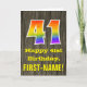 A frente desta design de cartão de saudação colorida, mas rústica, do aniversário apresenta um grande número "41" com um padrão inspirado no gradiente do espectro arco-íris, juntamente com a mensagem "Feliz aniversário de 41ruas", e um nome de destinatário personalizado. A frente apresenta um plano de fundo que mostra um padrão de inspiração de grãos de madeira falsa rústicos. O dentro apresenta uma mensagem de saudação de aniversário personalizável, ou talvez possa ser apagado e deixado o vazio se uma mensagem for escrita manualmente. Um cartão de aniversário como este pode ser uma maneira divertida de enviar desejos de aniversário a alguém que comemora seu quarenta primeiro aniversário. [~Z0000419]