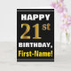 Este simples design de cartão de saudação com tema de aniversário apresenta um desejo de aniversário quente como "HAPPY aniversário de 21 anos, First-Name!" na frente, em texto a negrito sobre fundo preto. O número de aniversário tem uma aparência falsa e imitada de cor dourada. O nome na frente pode ser personalizado. O dentro apresenta uma mensagem de aniversário que pode ser personalizada. Um cartão de boas-vindas como este poderia ser uma maneira divertida de fazer votos de aniversário a alguém que comemora o seu vigésimo primeiro aniversário. [~Z0000275]