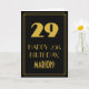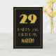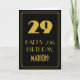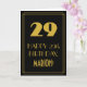 Este design de cartão de saudação de aniversário com visual retrô/vintage e inspirado na era dos Anos Loucos apresenta um grande número "29" inspirado no estilo art déco, a mensagem "FELIZ ANIVERSÁRIO DE 29 ANOS", um nome personalizado e um padrão de borda composto por linhas finas na frente. A frente tem um fundo preto. O interior contém uma mensagem de aniversário personalizada, ou talvez possa ser deixado em branco se uma mensagem for escrita à mão. Um cartão de aniversário editável como este pode ser usado para celebrar o vigésimo nono aniversário de alguém. [~Z0000499]