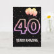 Balões de festa e confete sobre fundo preto com o neon número 40 para um aniversário de 40 anos.