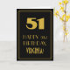 Este design de cartão de saudação com tema de aniversário do estilo 1920/1930s inspirado e estilo vintage/retro apresenta um grande estilo de deco de arte inspirado no número "51", a mensagem "HAPPY 51ruas BIRTHDAY", um nome personalizado e um padrão de borda composto por linhas finas na frente. O fundo da frente é preto colorido. O dentro tem uma mensagem de saudação de aniversário personalizável, ou talvez pudesse ser apagado e deixado o vazio se uma mensagem fosse escrita manualmente. Um cartão de saudação de aniversário personalizado como este pode ser enviado para comemorar o cinquenta e um anos de alguém. [~Z0000499]