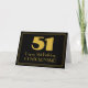 Este design de cartão de cumprimentos temático de aniversário inspirado no estilo da década de 1920/1930 apresenta uma grande numeração "51" inspirada no estilo art déco, a mensagem "Feliz Aniversário de 51 anos", um nome personalizado e um padrão de borda composto por linhas finas na frente. O fundo da frente é colorido de preto. O interior tem uma mensagem de aniversário personalizada, ou talvez possa ser limpo e deixado em branco se uma mensagem for escrita à mão. Um cartão de aniversário personalizado como este pode ser usado para reconhecer o aniversário de cinquenta e um anos de alguém. [~Z0000498]