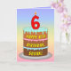 Este design de cartão de saudação temático de aniversário alegre e otimista apresenta uma representação em estilo cartoon de um bolo de aniversário de três níveis com uma vela em forma numérica no topo mostrando o número "6", juntamente com a mensagem "FELIZ 6 BIRTHDAY", e um nome de destinatário personalizado. O fundo da frente tem um espectro de gradiente de vários cores do arco-íris pastel inspirado em gradiente. O dentro tem uma mensagem de saudação de aniversário personalizada, ou talvez pudesse ser apagado e deixado vazio se uma mensagem fosse escrita manualmente. Um cartão de saudação de aniversário divertido e personalizado como este pode ser uma maneira divertida de entregar alguns desejos de aniversário a alguém que está celebrando seu sexto aniversário. [~Z0000625]