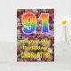 A frente desta colorida design de cartões de saudação de aniversário, com tema de outono, e inspirada na natureza apresenta um grande número de "91", tendo um padrão inspirado no espectro do arco-íris. Também apresenta a mensagem "Feliz aniversário do 91rua", e um nome personalizável. O fundo da frente do cartão apresenta um padrão rústico de folhas de outono. O dentro apresenta uma mensagem de saudação de aniversário personalizada, ou talvez possa ser apagado e deixado o vazio se uma mensagem for escrita manualmente. Um cartão de aniversário personalizado como este pode ser uma maneira divertida de enviar desejos de aniversário a alguém que comemora o seu nonagésimo primeiro aniversário. [~Z0000384]