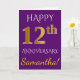 Este simples e personalizado cartão de comemoração de aniversário de casamento apresenta a mensagem "FELIZ 12 ANIVERSARY", com o "12" a ter uma aparência falsa de ouro. A frente também apresenta um nome personalizado e um fundo cor-de-roxo. A dentro apresenta uma mensagem de saudação de aniversário de casamento personalizável. Pode ser dado a um marido ou a uma mulher para celebrar o décimo segundo aniversário de casamento do casal. [~Z0000089]