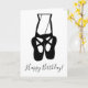 Cartão de aniversário com uma ilustração a preto e branco de um dançarino balé com pernas inferiores e pantufas de balé, em pé sobre os dedos, na ponta.