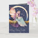 Cartão de aniversário com aquarela com uma fada flutuando no céu noturno com asas de borboleta. Cabelo roxo claro e detalhes em dourado. Dentro tem uma mensagem simpática para o aniversário de uma menina, mas este cartão pode ser usado para qualquer celebração. Ambos os lados do cartão interno são o céu noturno com nuvens e efeito de brilho.