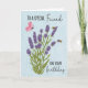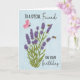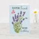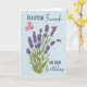 Este é um cartão de aniversário com uma planta de lavanda que tem duas abelhas e uma borboleta voando por aí. O fundo é azul claro, com textura nublada, e o texto "Para um Amigo Especial no Aniversário".