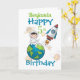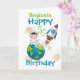 Um cartão de design espacial divertido para um 5 de aniversário com um astronauta sentado no mundo com um foguete espacial perto de um fundo de planetas e estrelas a disparar. Um design divertido para aqueles garotos que terão cinco anos. Pode ser personalizado alterando o nome e a idade e, em seguida, adicionar a sua própria dentro de mensagem. Um cartão de aniversário para um neto ou sobrinho.