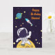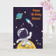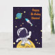 Um cartão de aniversário com um fundo azul escuro com estrelas amarelas espalhadas. Sobreposto está uma ilustração de um astronauta vestindo um traje espacial branco flutuando acima da lua. Acenando em cumprimento enquanto explora o espaço. Ao longe está um planeta com anéis e uma nave espacial voando para o espaço. Mensagem personalizada no interior.