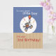 Um menino lindo e pequeno celebrará sua aniversário de 3 anos muito em breve. Coloque um sorriso em seu rosto com um ursinho de pelúcia giro cercado por confetti e bolinhas enquanto ele segura um balão. Um cheio de cor e amor.