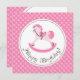 Doce convite de aniversário de cavalo de balanço com bolinhas cor-de-rosa.