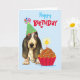 Feliz aniversário com este design bonitinho com um lindo e vista de chapéus de festa, o cachorrinho de Basset Hound com um cupcake de aniversário. O texto pode ser facilmente alterado; basta clicar no botão personalizar.