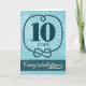 Este é um cartão de aniversário de 10 anos para funcionários com tema nauético em tons de azul / turquesa. O design apresenta um grande número de cor azul-turquesa 10, de cor escura, por baixo do qual está o texto: ANOS. Estes dois elementos de texto estão rodeados por uma borda de efeito de corda com um nó de figura 8 na parte inferior. Atrás disto está uma estrela branca rebentada. O fundo é uma turquesa clara com um abstrato de feint, ligeiramente náutico, sobre um padrão. Abaixo do texto de 10 ANOS e borda de corda, está uma caixa de texto com a palavra: Parabéns em branco, colocados contra uma borda de turquesa escura com uma camada de padrão de ondas feint. Natalie Kinnear