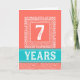 Este é um design distinto e atraente em coral, branco e turquesa. O número 7, em branco, é colocado dentro de um fundo quadrado que é enrolado decorativamente. Parte da fronteira consiste num padrão de ondas irregulares e é completada com um esboço composto pela palavra PARABÉNS que é escrita quatro vezes em torno do quadrado. Abaixo encontra-se o texto "ANOS", que é colocado sobre um fundo cor de turquesa, contrastando bem com a cor principal do coral. Por baixo da palavra 'ANOS' está um padrão que corresponde ao que faz parte da fronteira em torno do número 7. Natalie Kinnear Cards
