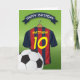 Crianças personalizadas, cartões de boas-vindas de feliz aniversário com um fundo verde esmaecido e uma camisa vermelha e azul listrada de futebol que você pode personalizar com o nome e a idade da criança, e uma bola no fundo. Este cartão de aniversário feliz de futebol vai impressionar o aniversariante seja seu filho/filha, sobrinho/sobrinha, neto/netinho ou amigo, literalmente qualquer um que esteja louco! Não se esqueça de adicionar sua mensagem especial dentro no cartão!
