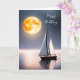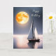 Navio à vela na água do oceano com lua de aniversário geral. O texto é editável.