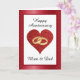 Mostre a sua mãe e pai um pouco de amor com esta elegante carta de aniversário. No centro está um coração de amor vermelho com dois anéis de casamento dourados no meio. Acima de um fundo branco está a mensagem "Feliz Aniversário" Abaixo de "Mãe e Pai", ambos são modelos para lhe dar a escolha de deixá-los como estão ou mudando para seu próprio texto. Ao redor da borda está um quadro vermelho brilhante com um padrão de pequenos corações cor-de-rosa. Dentro a placa é um modelo em texto preto para adicionar sua própria mensagem amorosa ou apagar para deixar o vazio.