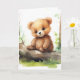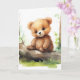 Um filhote de ursos marrom, bonito, sentado num tronco para o aniversário. O texto dentro é editável.