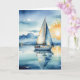 Uma pintura aquosa de um veleiro gira pacificamente através de águas calmas à medida que o sol nasce, lançando um brilho quente e reflexões na superfície. Todo o texto pode ser alterado.