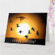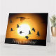 Os pássaros impressionantes do guindaste de Sandhill que voam na frente da luz intensa de um Sun enorme na silhueta, arte digital composta da fotografia, estão neste cartão grande do feliz aniversario.