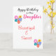 Desejos de aniversário da filha. Personalize para qualquer um. Linda e doce é escrita na frente em roteiros vermelhos. Flores bonito, de cor clara, em cor azul-rosa, cor laranja verde, contra fundo branco. Deixe dentro de mensagem especial ou personalize. Flores coloridas menores e folhas com penas no fundo. Arte original e Design de verso de placa © TamiraZDesines