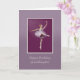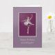 Este cartão do aniversário para uma neta caracteriza uma bailarina em um traje roxo e branco. Acima em seus dedos do pé, teve um pé estendido em uma posição de balé bonita. A bailarina tem o cabelo vermelho e há um projector macio que cai nela para trás. É colocada em um fundo - o vermelho e é cercado por uma luz - da beira roxa muito escura. O verso interno pode facilmente ser mudado para serir suas necessidades.