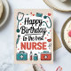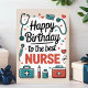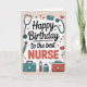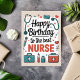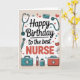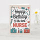 Esta design de cartão de aniversário de enfermeira personalizado inclui as palavras "Feliz Aniversário para a Melhor Enfermeira". Estas palavras estão rodeadas por várias ferramentas médicas e uma fronteira cor-de-rosa. A dentro do cartão diz "Desejando-lhe o mesmo cuidado e gentileza que você dá todos os dias. Feliz aniversário!" Você pode adicionar seu nome ao dentro desta placa. Aproveite!