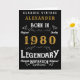 Diga Feliz Aniversário para aqueles nasceres em 1980 Adicione seu cartão de aniversário de nome. Edite o nome e o ano mais o dentro de mensagens com o modelo fornecido. Um maravilhoso cartão de aniversário preto com tipografia de estilo vintage branco e dourado. Este cartão também está disponível em um formato gigante para aquela grande surpresa. Mais presentes e suprimentos de festa disponíveis com o design "Legendário" na loja.