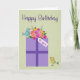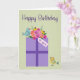 Este é um doce cartão de aniversário com um presente roxo com um buquê de flores para o arco e um casal de pássaros ao seu lado. O texto é Feliz Aniversário e a etiqueta no presente diz "para você".