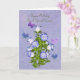 Personalize este cartão de saudação de aniversário para um primo usando os modelos de texto fornecidos no cobrir e no dentro para alterar ou apagar o texto. Quatro borboletas coloridas em tons de azul, roxo e rosa, pairam sobre um buquê de flores roxas e brancas em forma de sino. O fundo é um azul médio misturado. As folhas à volta das flores são um verde vívido. As flores são modificadas de Za Za Ssucata e Tubos e as borboletas de Pats Floral e Fauna, ambas de Designs Digitais de Sucata.