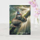 Uma preguiça vestindo uma festa de aniversário que se relaxa em um galho de árvore coberto de musgo em uma floresta tropical iluminada pelo sol. Todo o texto pode ser alterado.
